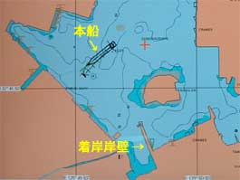 228.5メートルのプロダクト・タンカーの着岸状況を電子海図とレーダー画像で対比したも