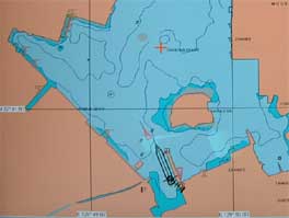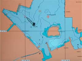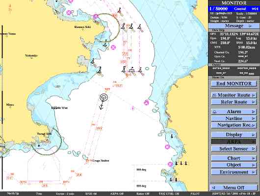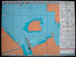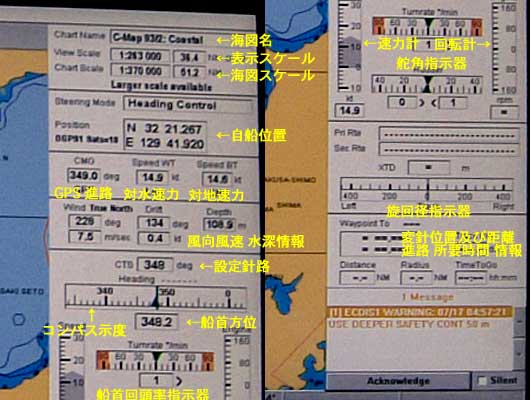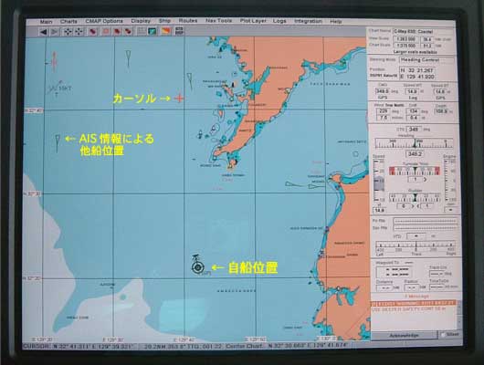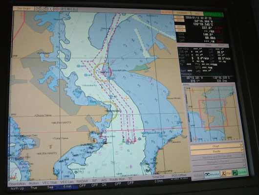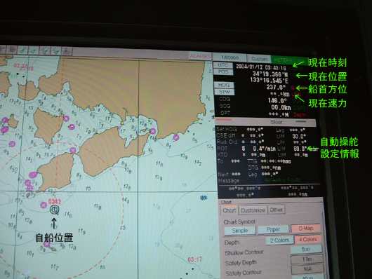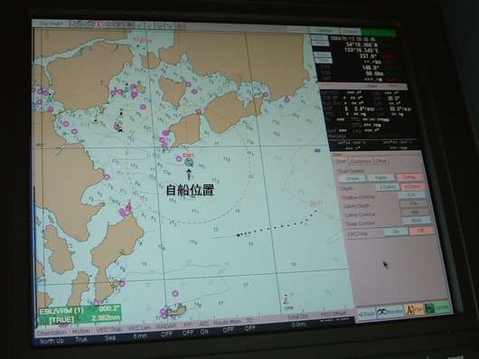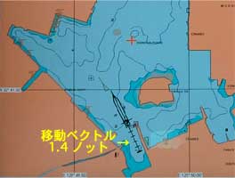 のです。どちらの画像にも船体の大きさが描かれていますし、電子海図には船体の動きがベ