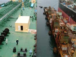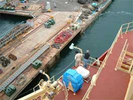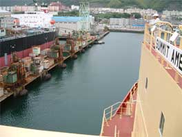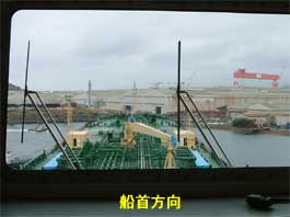 上4枚の写真は前の写真から3隻のタグ・ボートを使用して約 90度旋回させたときのも