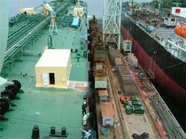 装工事が行われます。隣の岸壁に係留中の船も特殊塗装工事中の船です。 |