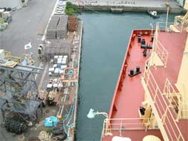 岸壁に平行になり、船首と船尾の係留索を取っているところです。 |